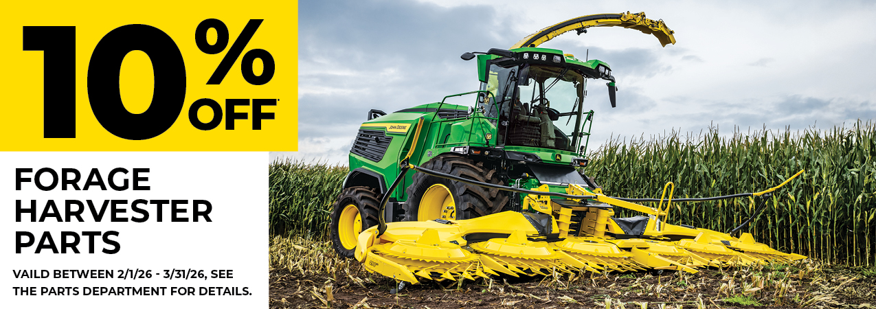 Keep your forage harvester performing at its best with Genuine John Deere Parts and get 10% off OEM parts for pull-type and self-propelled models (5000–9000 Series).